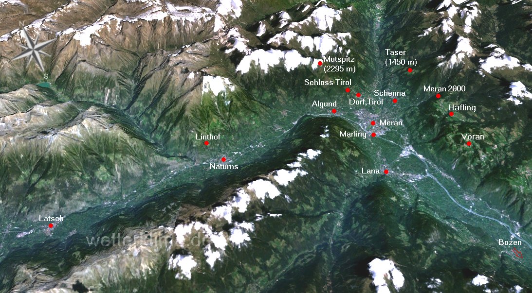 Meran Marling (Marlengo) Lana Latsch (Laces) Naturns (Naturno) Schloss Tirol (Castel Tirolo) Dorf Tirol Schenna (Scena) Taser Meran 2000 Algund (Lagundo) Mutspitz (Cima Muta) Linthof Bozen Hafling (Avelengo) Vöran