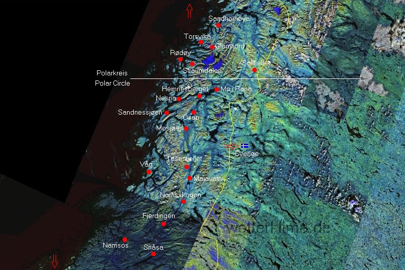 Mo i Rana Sandnessjoen Namsos Rødøy Glomfjord Mosjøen Schweden (Sverige) Sog og Fjordane, Oppland, Hedmark Troms, Finnmark Torsvika Majavatn Namsskogan Hemnesberget Saltfjellet Osen Snåsa Nesna Sandhorn ya Straumdalen Våg Tosenfjellet Fjerdingen