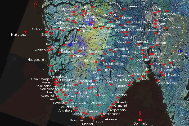 Mandal Flekkefjord Kristiansand Arendal Larvik Sandefjord Tonsberg Kongsberg Drammen Drøbak Oslo Stavanger Bergen Hovden Haugesund Voss Finse Flam Gol Hemsedal Fagernes Røldal Kvamskogen Eikje Sirevåg Hamar Vikersund Geilo Ål Porsgrunn Sirdal Moss Kjerringholmen Haukelifjell Gaustablikk Schiffe der Hurtigrouten Kinsarvik Grimstad Ljosland Kragerø Sauda Ljøsne Langhuso Vinje Vest Evanger Gullbotn Svelgane Sotrabroen Ustaoset Haugastøl Sæbovik Fitjar Løten Bortelid Rakkestad Dagali Klanten Norefjell Høgevarde Rosendal Schweden (Sverige) Denmark Sog og Fjordane Andabeløy Haglebu Evje Vierli Tregde Korshamn Drangsdalen Lyngdal Randaberg Tranby Flekkeroy Svinesund Nesbyen Søbekkseter Inntjoreheia Myrkdalen Skjold Svortland Vik Starmoen Lunde Stord Rjukan Bryne Lillestr m Gudvangen Storsj en Vensvangen Espa Minnesund Andelva Vikesåbakkane Kvassheim Sæleb Dalehefte  mli Haslestad Sprangfoss bru  Sagbukta  rje grense Ingedal Holstad Veggli Raulandsfjellet Vinje V ylen Hekni Hunnedalen  vstab Osestad S mmevågen Rege Brunnholen Vaulekrossen Buekrossen