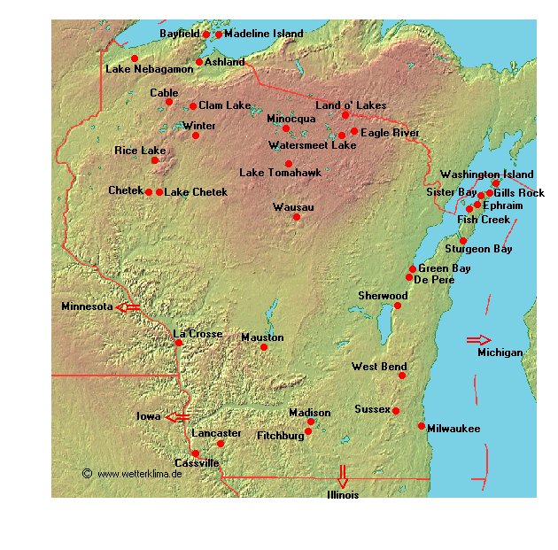 Ephraim http://www.wetterklima.de Green Bay Eagle River Clam Lake Mauston West Bend Sussex Fitchburg Milwaukee Madinson De Pere Lake Nebagamon Chetek Land o' Lakes Watersmeet Lake Minocqua Lancaster Sherwood Winter Wausau Lake Tomahawk La Crosse Washington Island Sister Bay Fish Creek Madeline Island Lake Chetek Cable Rice Lake Michigan Minnesota Iowa Illinois Bayfield Ashland Gills Rock Sturgeon Bay Cassville