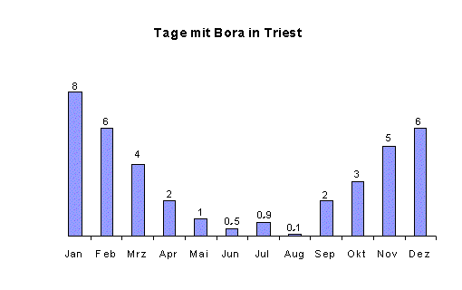 Die Bora ist ein trocken-kalter Wind, der aus den Bergen Sloweniens und Kroatiens ohne Vorwarnung (keine Wolken) auf die Adria niederstürzt. Der stark böige Wind erreicht stets Sturmstärke; Orkan ist ebenfalls keine Seltenheit. Kennzeichen: kurze Windstöße, kurze Pausen. Die Bora dauert im Mittel 2 Tage. Nach Italien hin schwächt sich der Wind rasch ab; selten bekommt die italienische Küste noch Sturm. Hauptsaison ist der Winter, wenn ein Hochdruckgebiet über dem Balkan Kaltluft ansammelt.