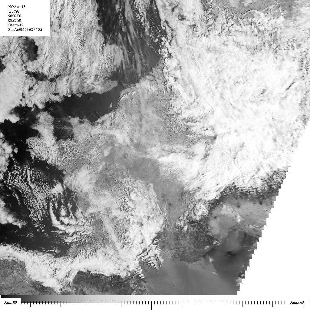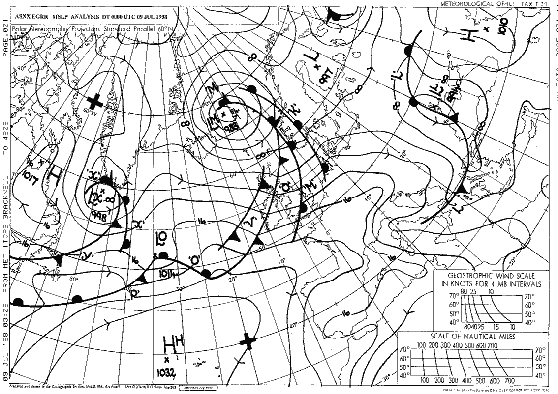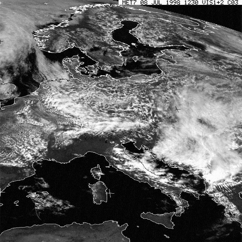 Am nächsten Tag, dem 9. Juli 1998, hat sich südlich der Alpen das Leetief zum Leetrog abgeschwächt. Auch hier sieht man die markante Staubewölkung nördlich der Gebirge.