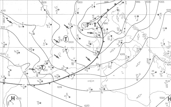 Auch der Stau an den Pyrenäen ist sichtbar, obwohl er in der Wetterkarte nicht deutlich als Hochkeil herauskommt.