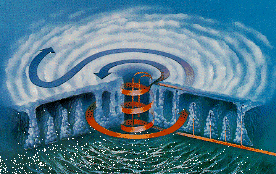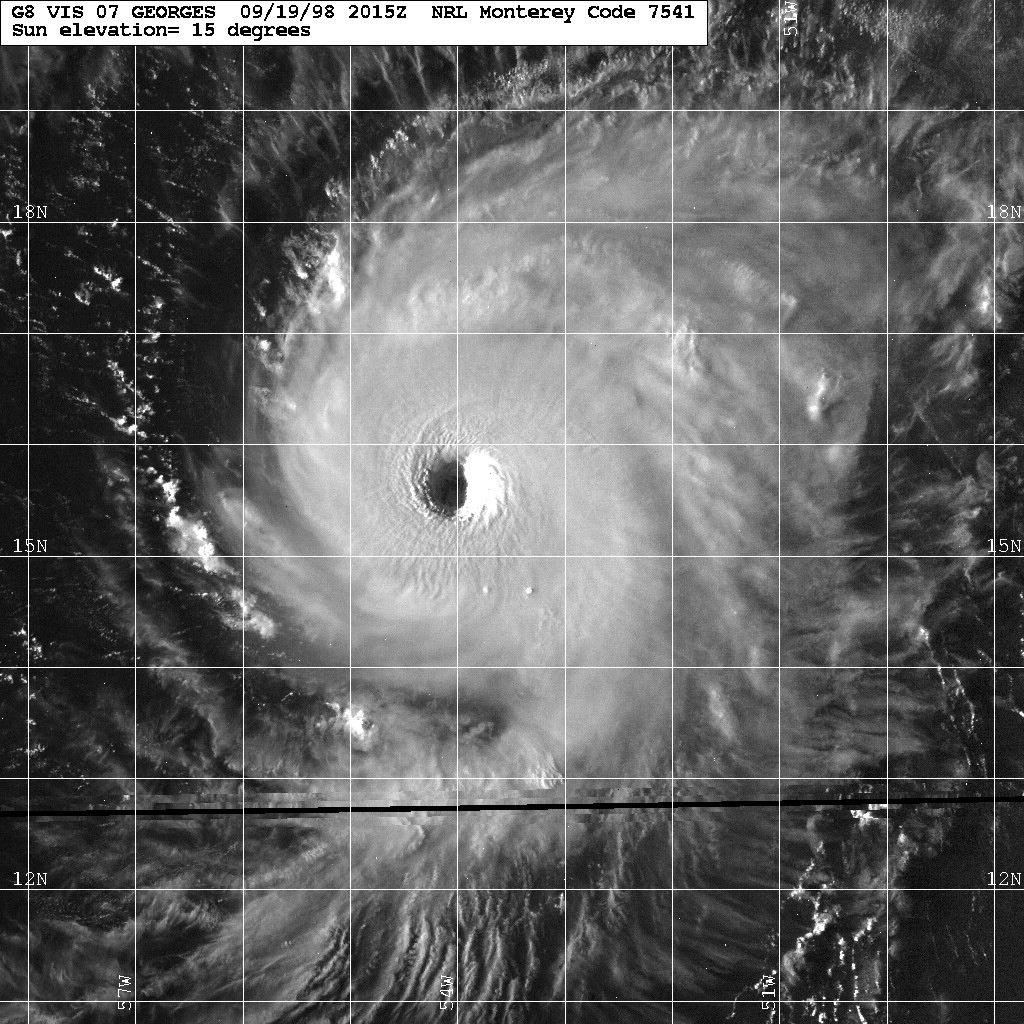 Ein Hurrikan ist ein tropischer Wirbelsturm mit einem Durchmesser von 500 km und einer Höhe von 15 km. Der Orkan heult mit mindestens 119 km/h, aber auch 200 km/h sind keine Seltenheit. (Wer mit seinem Motorrad auf der Autobahn 120 km/h gefahren ist, kennt den Anfang eines Orkans). Dabei kreist die Luft um das Zentrum; die Drehrichtung ist entgegen dem Uhrzeigersinn (auf der Nordhalbkugel, andersrum ist es auf der Südhemisphäre). Das Zentrum selbst besteht aus einem wolkenlosen, windstillen Loch mit einem Durchmesser von 30 km, dem Auge. Hier sinkt die Luft ab, und am Boden fällt der Luftdruck bis 880 hPa (früher mbar). Die Wolkenspiralen enthalten durchweg Gewitter, gegen die unsere gewohnten Wolkenbrüche nur ein müdes Tröpfeln sind.