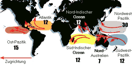 Nicht nur der Atlanik ist davon betroffen. Die Karte zeigt Gebiete, Zugrichtung und mittlere jährliche Zahl tropischer Stürme. Aus den weltweit 100 Stürmen entwickeln sich 50 zu Hurrikans weiter.