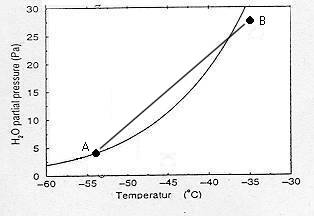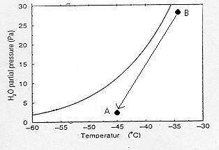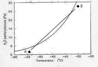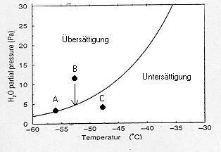 Ob sich in der Atmosphäre Wolken bilden, hängt vom Wasserdampf und von der Temperatur ab. Das wird in der folgenden Abbildung erläutert. Hier ist der Wasserdampfgehalt als Partialdruck über der Temperatur aufgetragen.![]() Punkt A liegt genau auf der Kurve: Es bilden sich Wolken. Aber nur, wenn genug Kondensationskerne da sind, das ist häufig nicht der Fall. Bei Punkt B ist die Atmosphäre übersättigt (Auch das passiert, wenn es zuwenig Kondensationskerne gibt). Werden Kondensationskerne zugeführt, bilden sich Wolken und der Dampfdruck sinkt bis auf die Kurve. Bei Punkt C gibt's keine Wolken. |