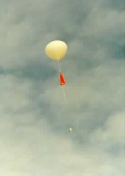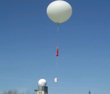 Die Sonde kurz vor dem Start. Das rote Tuch ist der Fallschirm, an dem die Sonde nach dem Platzen des Ballons zur Erde fällt. |