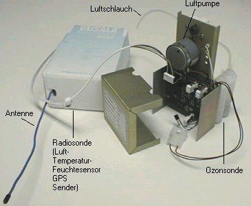 1. Grundlagen Die Ozonsonde mißt die vertikale Verteilung des Ozons über dem Beobachtungsort. Die Sonde ist an einem Ballon befestigt, der bis in eine Höhe von 30 bis 40 km steigt und dann platzt. Der Aufstieg bis in 30 km Höhe dauert etwa 90 Minuten. Zwar wird das vertikale Ozonprofil auch mit Satelliten gemessen, doch ist die vertikale Auflösung sehr grob, verglichen mit der 100 m-Auflösung einer Radiosonde. Weltweit gibt es rund 30 Stationen, die meisten in den mittleren Breiten der Nordhalbkugel. |