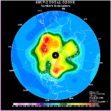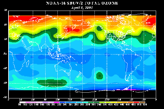 3. Die Produkte Täglich werden Verteilungen des Gesamtozongehalts für Nord- und Südhemisphäre sowie die ganze Erde veröffentlicht (die schwarzen Löcher an den Polen ist nicht etwa das Ozonloch, vielmehr fallen nachts die Messungen aus).