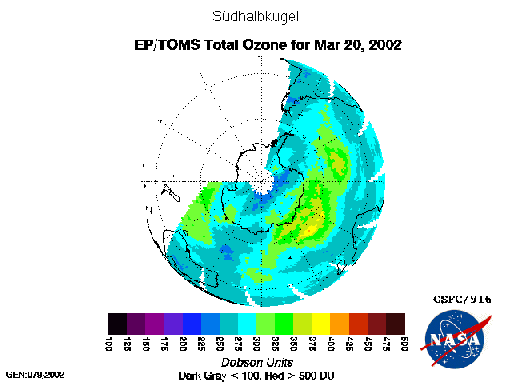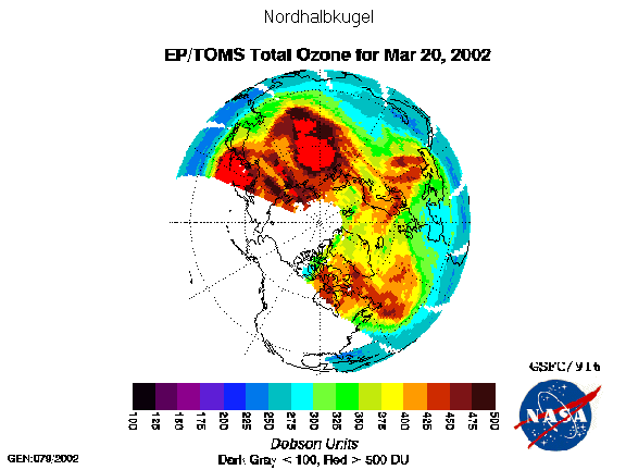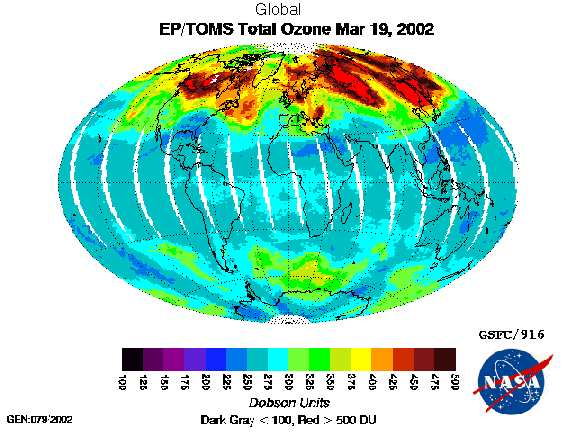 3. Die Produkte Die täglichen Ergebnisse für die Nordhalbkugel, Südhalbkugel und die ganze Erde werden zur Verfügung gestellt. Die weißen Flecken in den Hemisphärenkarten sind auf die nächtlichen Überflüge zurückzuführen (das Instrument braucht ja die rückgestreute Sonnenstarhlung). Deshalb können auch die Überflüge eines einzelnen Tages die globale Ozonverteilung nicht vollständig erfassen.